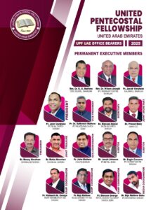 യു.പി.എഫ് യുഎഇ-യുടെ നാൽപത്തി മൂന്നാമത് തിരഞ്ഞെടുപ്പിലൂടെ ഈ പ്രവർത്തന വർഷത്തെ (2025) ഭാരവാഹികൾ കർമ്മസ്ഥാനികളായി. പ്രസിഡന്റ്‌ പദവിയിലേക്ക് പാസ്റ്റർ ജോൺ വർഗീസ് തിരഞ്ഞെടുക്കപ്പെട്ടു. വൈസ് പ്രസിഡന്റായി പാസ്റ്റർ സതീഷ് മാത്യു സ്ഥാനമേറ്റപ്പോൾ സെക്രട്ടറിയായി ബ്രദർ ബ്ലസ്സൻ ഡാനിയേലും ജോയിന്റ് സെക്രട്ടറി സ്ഥാനത്തേക്ക് പ്രസാദ് ബേബിയും ട്രഷർ പദവിയിൽ ബെന്നി എബ്രഹാമും ജോയിൻ ട്രഷർ ചുമതലയിലേക്ക് റോബിൻസ് കീച്ചേരിയും തിരഞ്ഞെടുക്കപ്പെട്ടു. ജനറൽ കോഡിനേറ്ററായി പാസ്റ്റർ ജോൺ മാത്യു നിയമിക്കപ്പെട്ടപ്പോൾ ക്യാമ്പ് കോർഡിനേറ്റർമാരായി പാസ്റ്റർ നിഷാന്ത് എം ജോർജ്, പാസ്റ്റർ റെജി മാത്യു, പാസ്റ്റർ ബ്ലസ്സൻ ജോർജ്ജ് എന്നിവർ നിയമിതരായി. മീഡിയ കോർഡിനേറ്റർ പദവിക്ക് ബിജോ മാത്യു ബാബു അർഹനായി. ഓഡിറ്റർ പദവികളിലേക്ക് ബ്രദർ ജേക്കബ് ജോൺസൺ, ബ്രദർ യൂജിൻ എന്നിവരെ തിരഞ്ഞെടുത്തു.